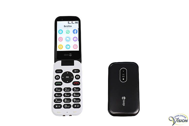 Doro 7030 quadband GSM schelpmodel voor senioren en slechtzienden met Whatsapp en Facebook, zwarte toetsen en witte cijfers, verlicht toetsenbord, groot verlicht kleurendisplay van 58 x 45 mm en groot instelbare tekstweergave, assistentietoets voor vooraf ingestelde hulpnummers, foto-telefoonboek voor 500 namen met elk 3 nummers, camerasneltoets, top 10 snelkies nummers, handenvrij bellen, WiFi, bluetooth, GPS, MMS, agenda, radio, alarm en rekenmachine, gewicht 107 gram, afmetingen 109 x 57 x 21 mm, geschikt voor de meeste gehoorapparaten, kleur zwart/wit.incl. oortelefoon, oplaadstation en adapter, simlockvrij en geschikt voor 2 nano-simkaarten.