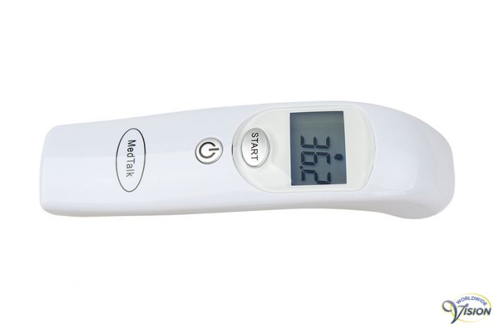 Koortsthermometer IR MedTalk, meertalig waaronder Duits, Engels, Spaans, Frans, Russisch en Italiaans sprekende infrarode voorhoofd- en omgevingsthermometer, meetbereik voor lichaam van 34 tot 43°C. met een nauwkeurigheid van 0,3°C., meet binnen 1 seconde de temperatuur, geheugen voor 12 laatste metingen en automatische uitschakeling na 1 minuut, groot digitaal LCD-display, gewicht circa 76 gram, afmetingen 140 x 40 x 20 mm, kleur wit, incl. kunststof opbergdoosje en excl. 2 AAA batterijen.