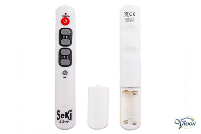 Seki Slim universele afstandsbediening met zes grote, tactiele toetsen voor TV/Audio met de volgende basisfuncties: kanalen wisselen – volume regelen – aan en uit – mute (geluid uit) of AV-functie (schakelen naar andere bron), gewicht 35 gram, afmetingen 174 x 29 x 20 mm, kleur wit, excl. 2 AAA batterijen.
