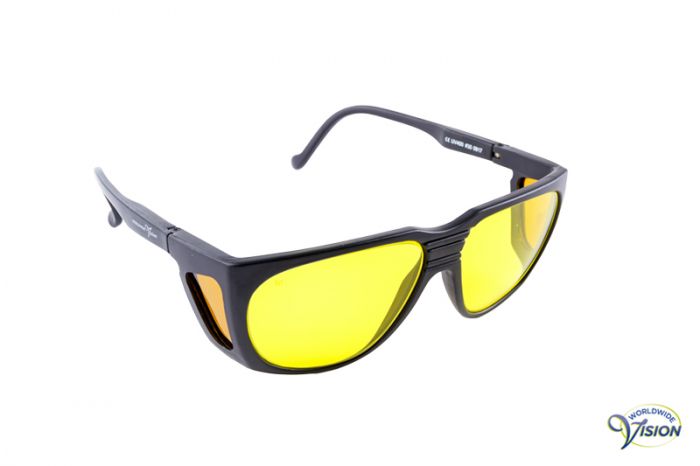 Spectra-Shield 450 non-fitover zonne-/kantfilterbril (normaal model), beschermt 100% tegen UV-a, b en c stralen tot 400 Nm, gele lenzen en zijkanten met zwart montuur en buigzame veren, 87% lichtdoorlaatbaar, incl. etui. Geschikt voor zon-ski-sport en mensen met glaucoom, pre-kataract en nachtblindheid.