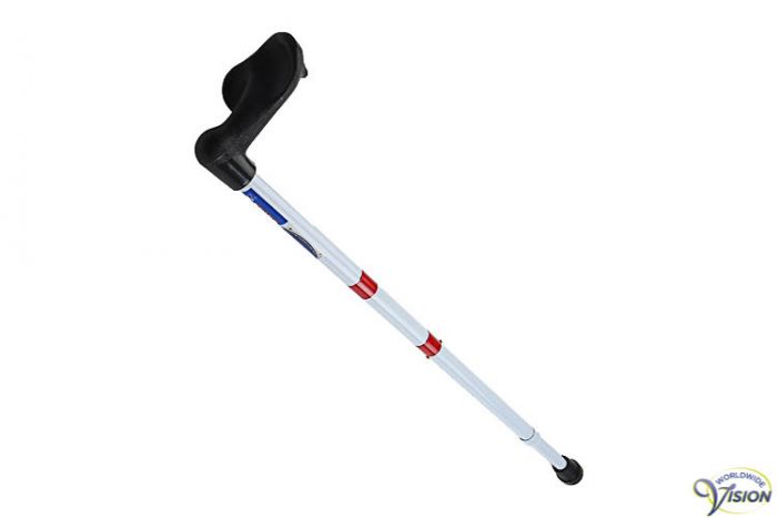 Steunstok van aluminium met anatomische linksgevormde handgreep, diameter 22/19 mm, voorzien van 2 rode reflectie bandjes, gewicht circa 380 gram, lengte incl. dop in stappen verstelbaar van 78 tot 101 cm, max draagvermogen 100 kg.